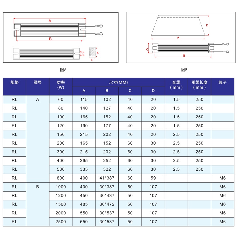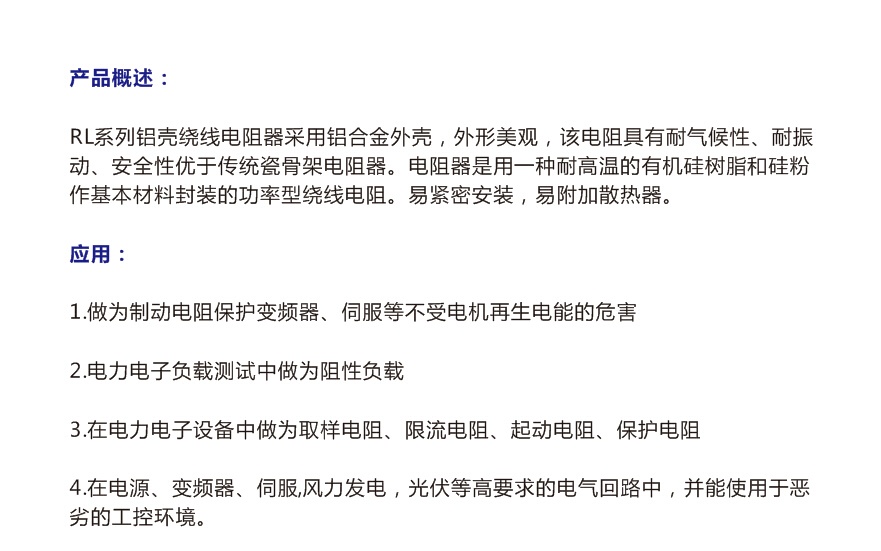RL系列铝壳绕线电阻器采用铝合金外壳,外形美观,该电阻具有耐气候性、耐振动、安全性优于传统瓷骨架电阻器。电阻器是用一种耐高温的有机硅树脂和硅粉作基本材料封装的功率型绕线电阻。易紧密安装,易附加散热器。